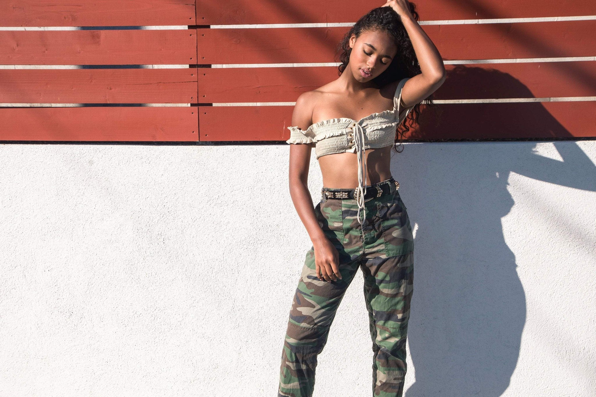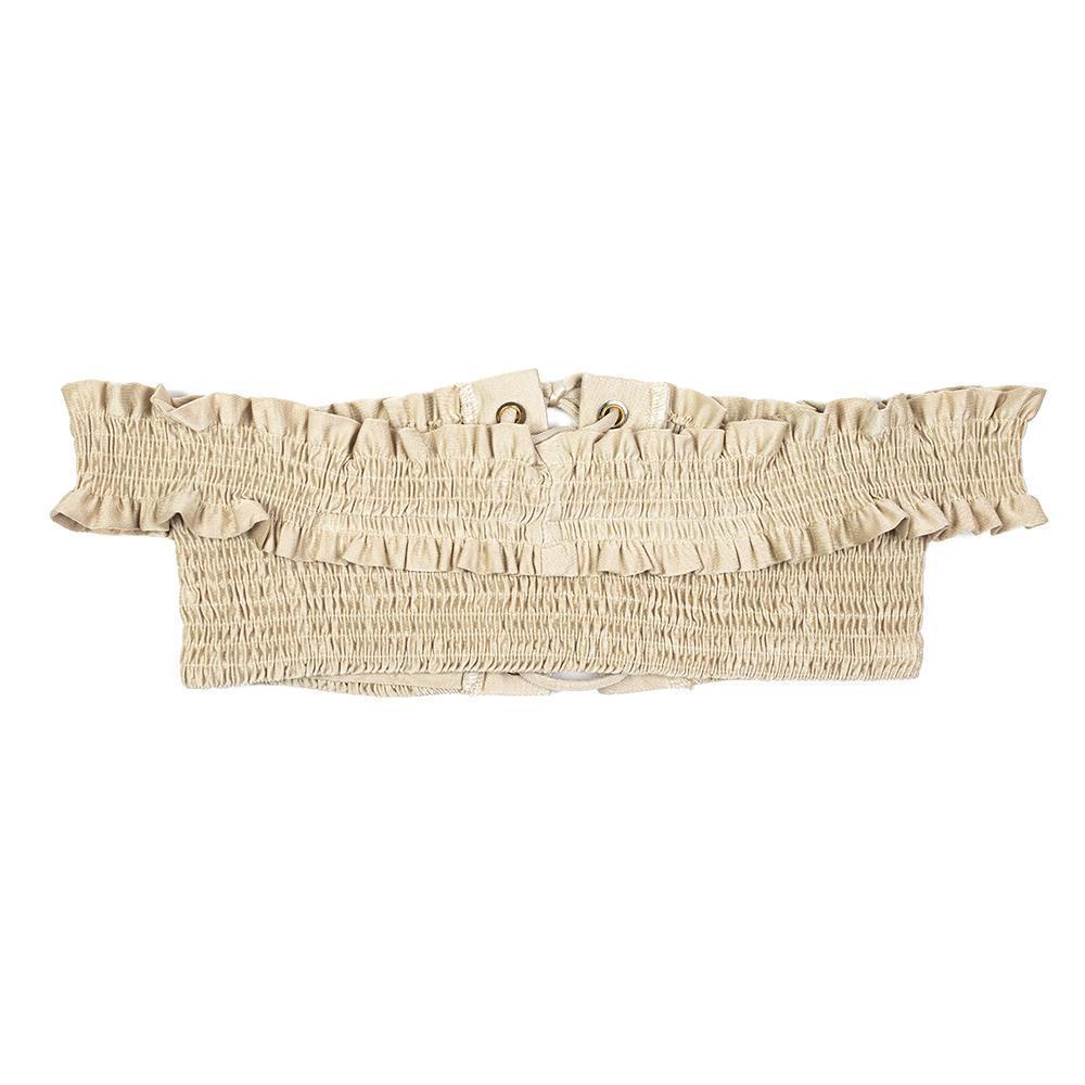 Holding onto Summer? We got you covered! Summer isn't over yet babe! You'll feel like a goddess in the Malibu Swim Top featuring a beautiful champagne finish with flirty ruffle details. Play it safe and wear the Malibu as a swim top, or get edgy and pair it with camo joggers for a night out!
